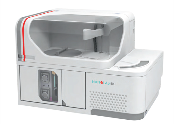 Nanolab 500 is a compact, fully automated, random-access clinical chemistry analyzer designed for mid- to high-volume laboratories. With a throughput of up to 300 photometric tests per hour or 480 tests per hour with the optional ISE module, it delivers high performance in a small footprint.