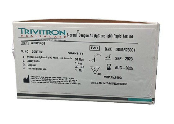 Biocard® Dengue Ab (IgG/IgM) Rapid Test Kit is a rapid immunochromatographic assay for the qualitative and differential detection of IgG and IgM antibodies to Dengue virus in the human whole blood/ serum/ plasma. The virus is transmitted by mosquitos of the day-time biting Stegemyia family, principally Aedes aegypti and Aedes albopictus.