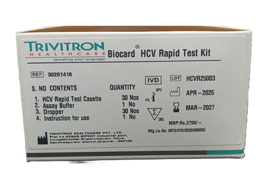 Biocard HCV Rapid Test Kit is a quick and reliable in vitro diagnostic test for detecting antibodies to Hepatitis C Virus (HCV) in blood, serum, or plasma.