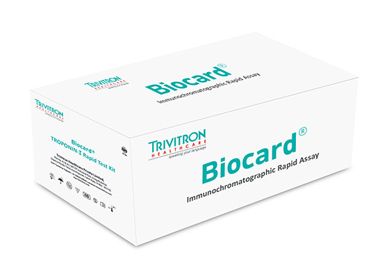 The BIOCARD® Troponin I Rapid Test Kit is a valuable aid in diagnosing Acute Myocardial Infarction(AMI), supporting timely clinical decisions and better patient outcomes Troponin I (Trop I) is a cardiac-specific protein released into circulation exclusively after myocardial cell damage. Its high tissue specificity eliminates interference from skeletal muscle injury, ensuring unmatched diagnostic accuracy. Trop I levels rise within 3–6 hours of an acute myocardial infarction, peak at 12–24 hours and remain elevated for up to 7–10days, offering both early detection and a prolonged diagnostic window. Owing to its superior sensitivity and specificity, Trop I is regarded as the gold standard biomarker for diagnosing and monitoring acute coronary syndromes and myocardial injury.